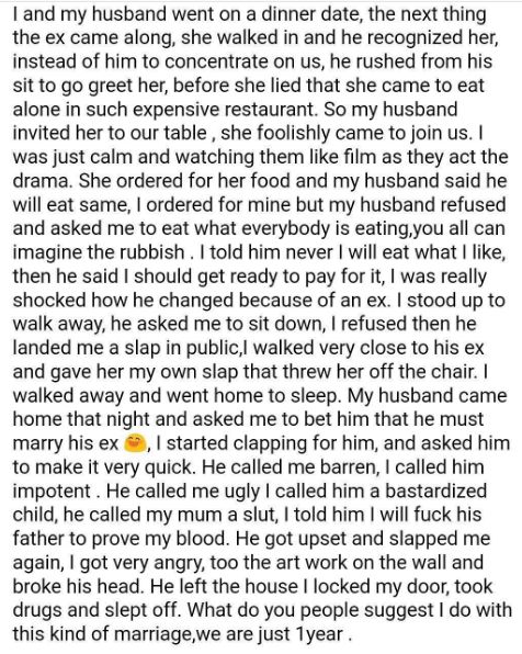 When a man or woman refused to forget about their ex after marriage, expect issues. Now their one year old marriage is about to pack up. Read what the wife shared...