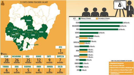 Thirteen states have not paid their teachers some for as long as 28 months, according to the Nigerian Union Teachers (NUT).