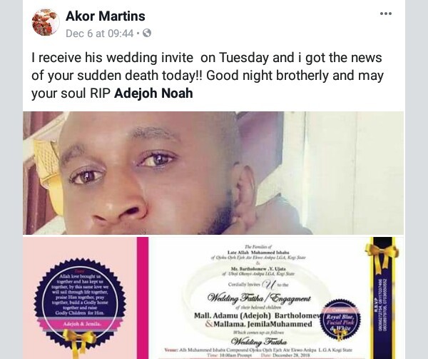 A promising Nigerian man, Adejoh Noah has sadly died leaving family and fiends utterly heartbroken. He passed away on December 6, a day after sending out his wedding invites to friends.