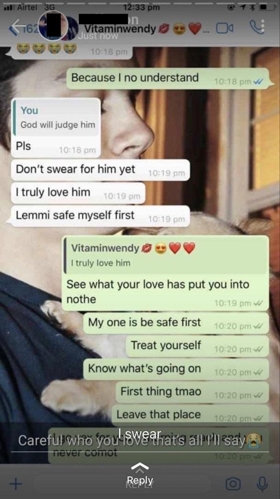 According to a recent chat she had with a friend before her death, Wendy said she dreamt that she was bleeding and was told, in the dream, that her boyfriend had used her for ritual.